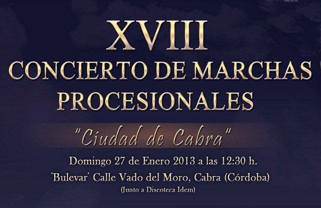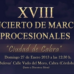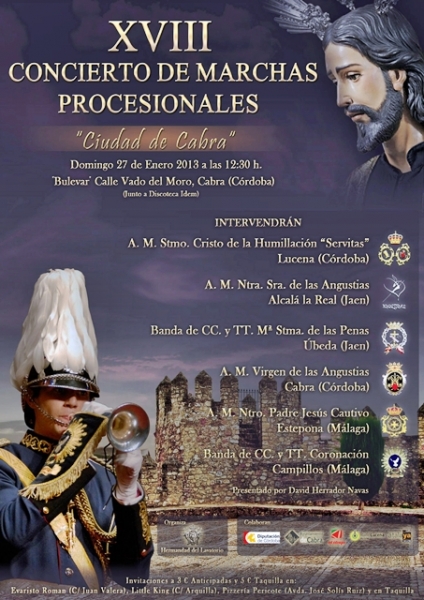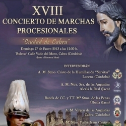 Todo un elenco de grandes formaciones musicales del territorio andaluz conforman el cartel que la Hermandad del Lavatorio ha confeccionado para la celebración del 18 Concierto de Marchas Procesionales "Ciudad de Cabra" entre las que destacan las nuevas formaciones que este año visitarán nuestra Ciudad en Semana Santa el Domingo de Ramos con las Hermandades de la Pollinita y el Huerto como son la Banda de Cornetas y Tambores "María Stma. de las Penas" de Úbeda (Jaén) o la Agrupación Musical "Ntro. Padre Jesús Cautivo" de Estepona (Málaga) respectivamente.