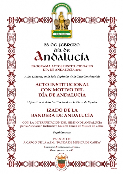 A las 12:00h tiene lugar en el salón de plenos del Ayuntamiento el acto institucional que con motivo del Día de Andalucía ha organizado el Ayuntamiento de nuestra ciudad. Al término del mismo se procederá al izado de la Bandera de Andalucía en la puerta de la Casa Consistorial con la interpretación del Himno a cargo de la A.I.M. Banda de Música de Cabra, que realizará un pasacalles (si el tiempo no lo impide).