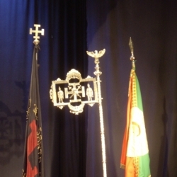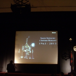 El pregonero recreó también sus recuerdos familiares desde el barrio de Santa Lucía y su vinculación a través de su padre al Imperio. También fue mencionando a personas que han tenido un papel relevante en la historia reciente de la Cofradía del Sepulcro y del medio siglo del Imperio Romano. Como homenaje a todos estos cofrades, incluyendo a los diez pregoneros que le han precedido en este acto, Salvador presentaba un audiovisual conmemorativo con algunas imágenes inéditas de la historia de las cuadrillas de romanos de nuestra ciudad.