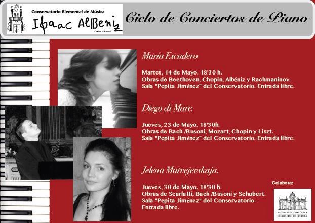 El primero de ellos tendrá lugar el próximo martes, 14 de mayo a las 18:30 horas cuando la pianista María Escudero interpretará obras de Beethoven, Chopin, Albéniz y Rachmaninov.