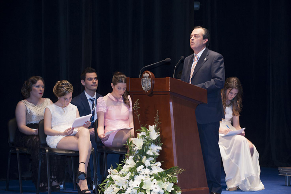 Comenzaba el acto a las 20:30h. en un Teatro repleto en su aforo. Tras el vídeo institucional sobre la historia y realidad educativa del Antiguo Real Colegio de la Purísima hoy Instituto de Educación Secundaria "Aguilar y Eslava", tomó la palabra su Director, Francisco Ortiz Gama, que en su salutación destacó la importancia de la educación y la trayectoria del alumnado que se graduaba. A continuación, intervino el Presidente de la Fundación, Salvador Guzmán Moral, para destacar el valor de la formación y estudio en tiempos de crisis, así como reconocer a los alumnos de otras localidades que vienen a estudiar al Aguilar y Eslava. En tercer lugar, intervendría la Presidenta de la A.M.P.A. "Pepita Jiménez", Rosario Criado González, que recordaría el papel que juegan las familias en la formación de sus hijos e hijas, al tiempo que felicitaba al Claustro de Profesores del Instituto por su profesionalidad.
