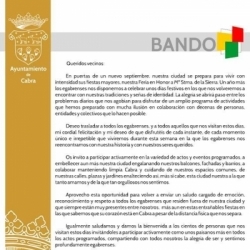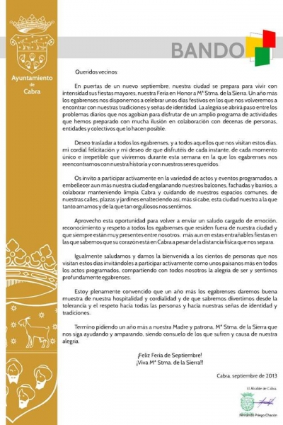 Aprovecho esta oportunidad para volver a enviar un saludo cargado de emoción, reconocimiento y respeto a todos los egabrenses que residen fuera de nuestra ciudad y que siempre están muy presentes entre nosotros, más aun en estas entrañables fiestas en las que sabemos que su corazón está en Cabra a pesar de la distancia física que nos separa.