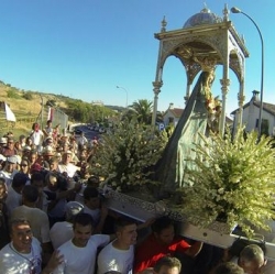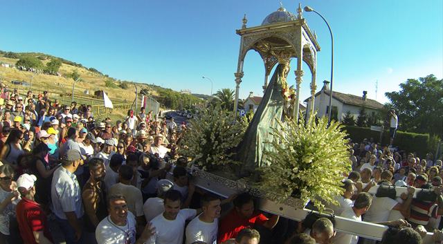 Entre un gentío de romeros y devotos, la virgen, con el solo sonido del tambor y los vivas clamorosos alcanzaba la escalinata de la Parroquia de San Francisco y San Rodrigo donde con primor y detalle fue cambiada de manto por su vestidor mientras recibía cantos y oraciones de los allí presentes.