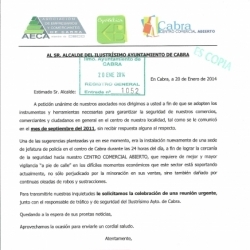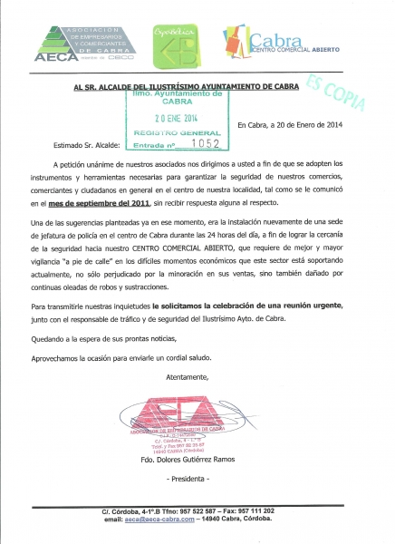 En el escrito, que adjuntamos en esta información tal y como nos ha sido remitido, AECA solicita al Alcalde de Cabra, Fernando Priego para que "se adopten los instrumentos y herramientas necesarias para garantizar la seguridad de nuestros comercios, comerciantes y ciudadanos en general en el centro de nuestra localidad, tal como se le comunicó en el mes de septiembre de 2011 sin recibir respuesta alguna al respecto" afirma AECA.