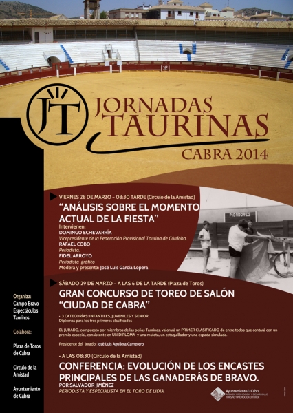 Las Jornadas Taurinas comenzarán este viernes con una Mesa Redonda en el que bajo el título "Análisis sobre el momento actual de la Fiesta" intervendrán el Vicepresidente de la Federación Provincial Taurina de Córdoba, Domingo Echevarría, el periodista Rafael Cobo y el periodista gráfico Fidel Arroyo. Estará moderada y presentada por José Luis García Lopera.- Será a las 20:30 horas en el Círculo de la Amistad.