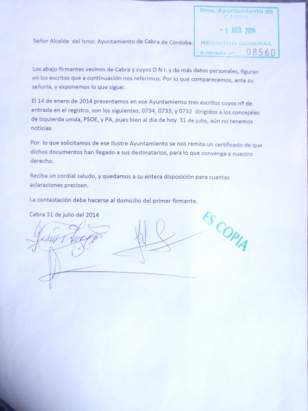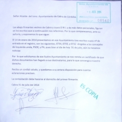 En este sentido, Democracia Real Ya de Cabra indica que el pasado 14 de enero se dio registro de entrada a un documento instando a los Grupos Municipales para que "tomasen cartas en el asunto" con el fin de "recuperar el uso del tablón municipal", pero según el colectivo "A fecha del 31 de julio, ningún grupo se ha pronunciado sobre este hecho. Es por ello, por lo que se ha presentado, a fecha del 1 de agosto, un documento solicitando que se certifique, por parte de la secretaría, si los documentos han llegado a sus destinatario, puesto que al día de hoy no hemos recibido una contestación motivada de por qué se actúa de esta manera, toda vez que los ciudadanos según el artículo 9 de la constitución tenemos derecho a ser informados puesto que así lo prescribe la L.O. 7/85 del 2 de abril en su artículo 70.2 y que desarrolla el R.D. 2558/1986 del 28 de noviembre por el que se aprueba el R.O. de funcionamiento y régimen jurídico de las localidades (artículo 229.1)"