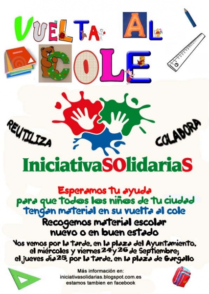 Hacemos un llamamiento a los ciudadanos para que acudan a estas mesas con material escolar nuevo o en buen estado de uso (cuadernos, lápices, colores, plastilina, pinturas, reglas, bolígrafos, folios, etc.) a ser posible adquirido en comercios locales. De todas formas, todo lo que se recoja, bienvenido será.