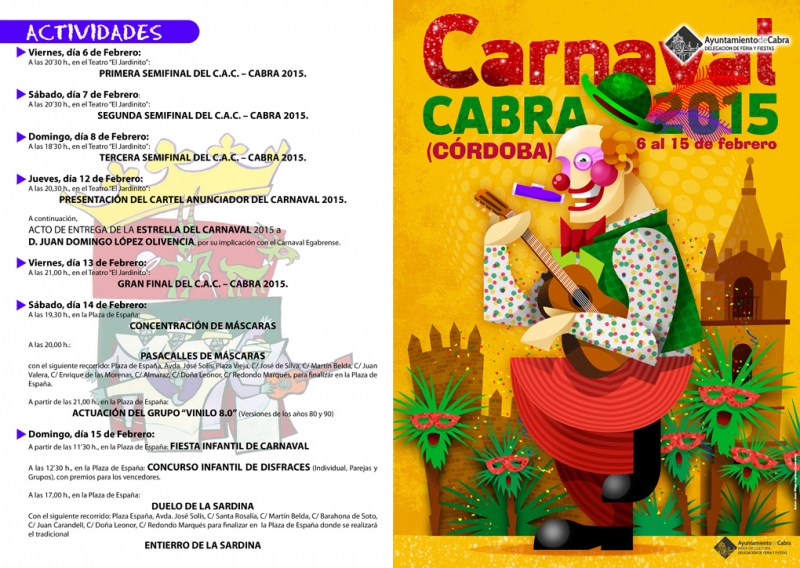 Finalmente el domingo 15 será la fiesta infantil de Carnaval, a partir de las 11:30h y luego será el concurso de disfraces infantiles. Por la tarde, a eso de las cinco, será el duelo y entierro de la sardina, que dará por finalizadas estas fiestas de carnaval 2015.