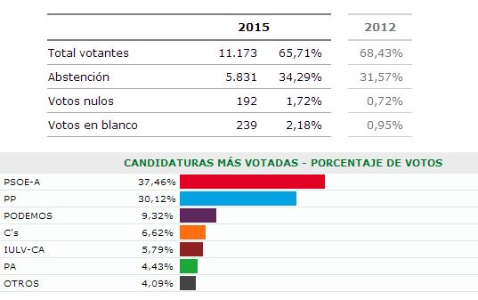 En cuanto a nuestra ciudad, en Cabra el censo de este año es ligeramente inferior al de 2012, ya que entonces teníamos 17.036 electores frente a los 17.004 de 2015. De ellos, participaron en las votaciones 11.658 lo que supuso un 68,43% y una abstención del 31,57%.