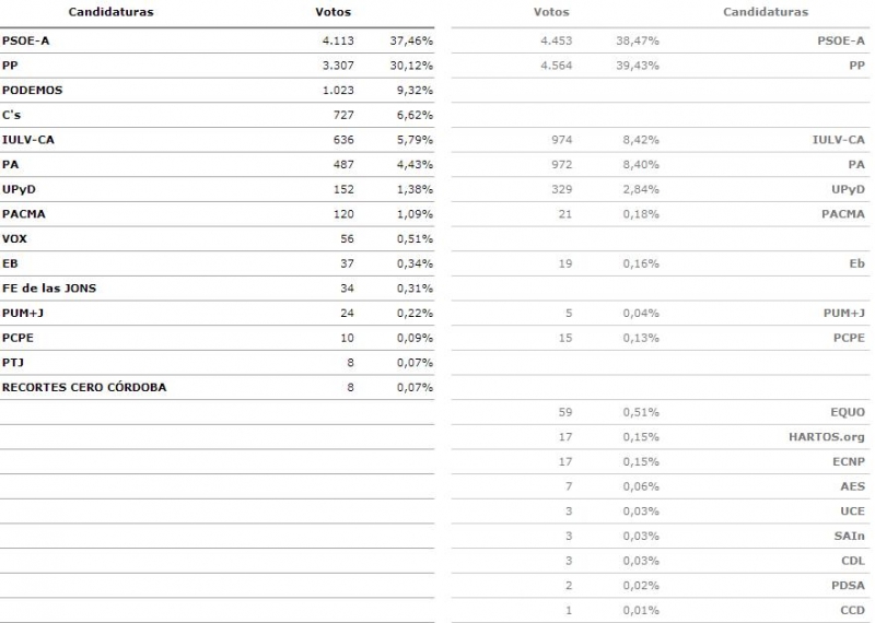 El PP obtuvo un 39,43% (4.464 votos); el PSOE un 38,47% (4.453 votos); la formación Izquierda Unida- Los Verdes, un 8,42% (974 votos); el PA un 8,4% (972 votos) y el partido de UPyD un 2,84%(329 votos). El resto de formaciones no llegó a obtener un 0,5% en ninguno de los casos, aunque obtuvieron votos todas las candidaturas presentadas en nuestra provincia.
