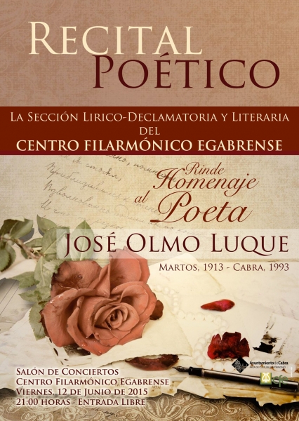 No lo olviden: Viernes 12 de junio, a las 21:00 horas, en el Salón de Conciertos del Centro Filarmónico Egabrense, Homenaje al poeta José Olmo Luque (Martos, 1913 - Cabra, 1993).
