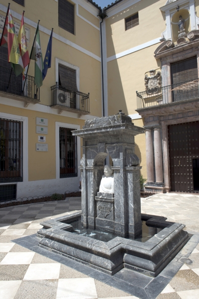 La idea "nos gustó mucho", comentó el primer edil, quien durante la visita al lugar recordó que se ha conseguido "recuperar el sabor de antes, el diseño arquitectónico original que la plaza tenía" allá por el año 1932. Del proyecto de Luis Berges Martínez destacan su trazado con un ajedrezado en piedra caliza y enchinado cordobés, y la fuente monumento central donde con la estatua de D. Luis de Aguilar y Eslava en mármol, obra del artista local Antonio Maíz Castro, y que también se ha restaurado.