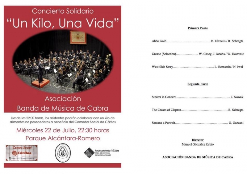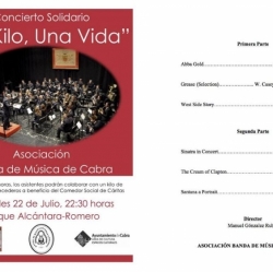 El Paseo Alcántara Romeró será el escenario, el próximo miércoles 22 de julio, a las 22:30h, del concierto benéfico ofrecido por la Banda de Música de Cabra. Las personas que quieran colaborar con esta iniciativa no solo van a disfrutar de una magnífica noche musical en nuestro Paseo, sino que podrán llevar un kilo de comida para el comedor de Cáritas de la calle Priego.
