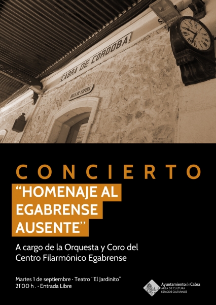 El próximo 1 de septiembre, el Centro Filarmónico Egabrense, ofrece el concierto Homenaje al Egabrense Ausente, que tendrá lugar en el Teatro El Jardinito, a las nueve de la noche, con la participación de la Orquesta y Coros de la Casa de la Música de nuestra ciudad. Será uno de los actos previos a la Feria de Septiembre que, desde hace años, abre uno de los meses más esperados del calendario festivo egabrense.