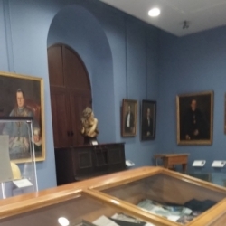Dos ediciones de lujo del Quijote, de extraordinaria factura, forman parte de esta vitrina. La una, anotada por Nicolás Díaz de Benjumea e ilustrada por Ricardo Balaca y José Luis Pellicer (Barcelona, Montaner y Simón, 1880-1883). La otra, adornada con láminas en cobre, cuyas planchas son propiedad de la Real Academia Española (Madrid, 1862).