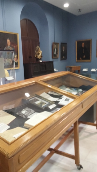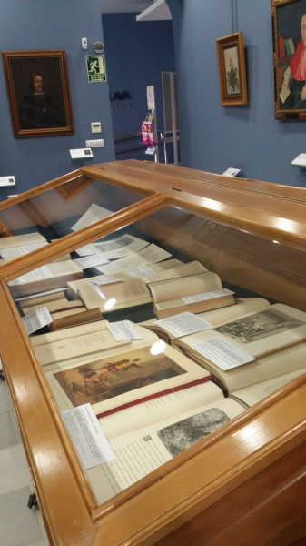 La primera vitrina de la exposición contiene dos joyas del fondo bibliográfico de la Biblioteca Histórica Aguilar Eslava: una de 1615, el mismo año que la publicación de la segunda parte del Quijote en la que se alude a la famosa sima de Cabra, y otra de la primera edición facsímile de la inmortal obra cervantina. La de 1615, dada a la estampa en Sevilla, es "Flos sanctorum: fiestas, i Santos naturales de la ciudad de Cordova" del padre Martín de Roa (1563-1637). En ella aparecen los mártires egabrenses San Rodrigo, San Witesindo y San Argimiro. En la biografía de San Witesindo, cuando habla de La Nava, dice: "No lejos de ella, se abre la tierra en tanta profundidad entre unas peñas, que se cree no tener suelo, tanto que dio lugar al proverbio celebrado en España, sima de Cabra, que así llamamos los españoles semejantes honduras". Las sucesivas propiedades del volumen quedan manuscritas en sus páginas: primero fue de D. José Chacón y Río, rector y cura de la iglesia parroquial de Santiago de Montilla. Éste se lo regaló a D. Lorenzo de Porras Vicentelo, natural y vecino de Sevilla en el 1737, quien lo donó por su muerte al Colegio de la Purísima Concepción de la villa de Cabra.