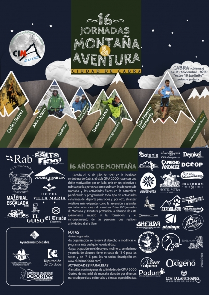 Del 6 al 8 de noviembre de 2015 tendrá lugar en Cabra una nueva edición de las Jornadas de Montaña y Aventura que organiza el Club CIMA 2000, siendo las únicas que se celebran en Córdoba y una de las cuatro que tienen lugar en Andalucía. Avaladas por la Federación Andaluza de Montañismo, llegan a su décimo sexta edición y constituyen todo un referente no solo en el ámbito andaluz sino también a nivel de toda España, por la calidad de los ponentes que participan y la buena organización.