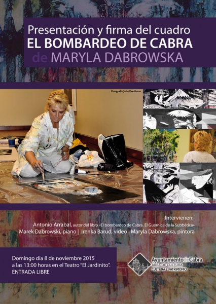 El acto contará con la introducción de Antonio Arrabal, miembro que en su día designó el consistorio para formar parte de la comisión organizadora de los actos del 75 aniversario del bombardeo y autor del libro "El Bombardeo de Cabra. El Guernica de la Subbética". Asimismo, se podrá escuchar una breve interpretación musical al piano a cargo de Marek Dabrowski denominada "Guerra y Paz", mientras se proyecta un video sobre la obra pictórica realizado por la hija de la artista, Irenka Barud.