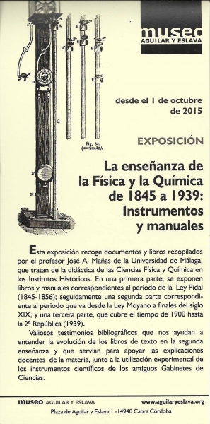 Les recordamos también que desde el Museo Aguilar y Eslava, su fundación ha organizado desde el pasado 1 de octubre la exposición La enseñanza de la Física y la Química. Instrumentos y manuales. De 1845 a 1939. Esta exposición se enmarca por sí misma en ese patrimonio técnico que nuestro centenario Instituto y la Fundación Aguilar y Eslava, conservan y ofrecen a cuántas personas quieran conocer estas curiosas colecciones.