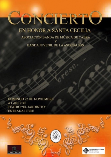 Este año la fiesta de la patrona de la Música cae en domingo, razón por la que ese día tendremos actividades, como es el caso de la Asociación Instructivo Musical Banda de Música de Cabra que en su Concierto de Santa Cecilia, contará también con la participación de la Banda Juvenil de Música (que este año celebra su décimo aniversario) dirigida por Víctor Herrero Pareja. Junto a los jóvenes músicos, el concierto del 22 de noviembre de la Banda Sinfónica de Música de Cabra contará con la participación como solistas de: