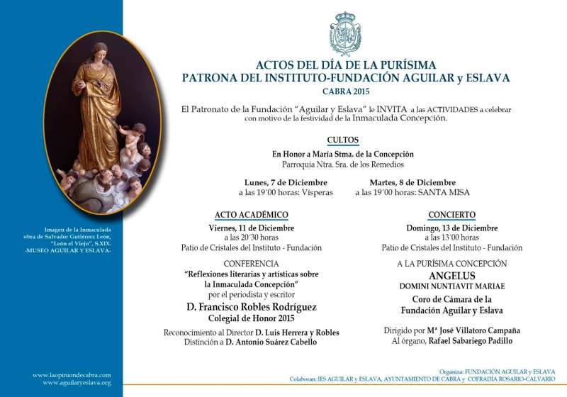 El próximo viernes, 11 de diciembre a las 20´30 h. en el Patio de Cristales del Instituto-Fundación Aguilar y Eslava, tendrá lugar un acto académico en el que intervendrá el conocido periodista y escritor Francisco Robles Rodríguez, que impartirá la conferencia titulada: "Reflexiones literarias y artísticas sobre la Inmaculada Concepción", a continuación recibirá la beca que lo distingue como Colegial de Honor de la Fundación Aguilar y Eslava.