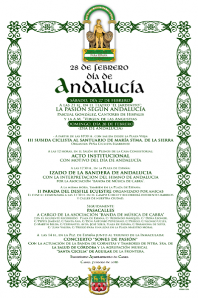 Un nuevo 28 de Febrero se acerca y dado que será domingo y que estamos en año bisiesto, el 29 alarga este fin de semana cuaresmero, convirtiéndolo en uno de los "puentes" de este 2016. Actividades deportivas, musicales, cofradieras e institucionales se entremezclan para convocar a la ciudadanía a una jornada en la que los andaluces celebramos el aniversario del Referéndum que movilizó a Andalucía para formar parte de las autonomías españolas del art. 151 de la Constitución del 78.