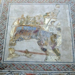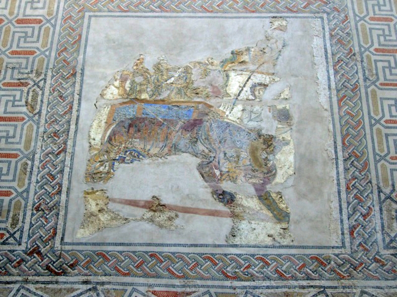 Las paredes de la edificación romana conservan restos de estuco decorado con bandas de color rojo y sus suelos presentan fragmentos de mosaicos de finales del siglo III, en su mayor parte geométricos aunque también los hay vegetales y figurativos.