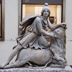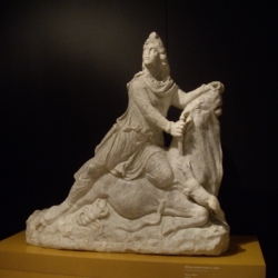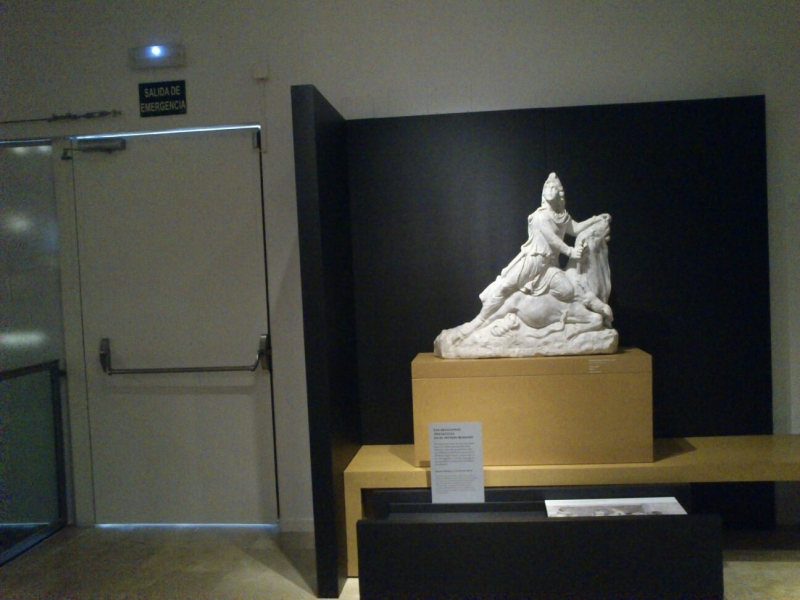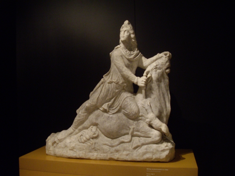 El Mitra es una escultura realizada en mármol blanco y restaurada en 2008, siendo uno de los escasos ejemplares que muestran en España el ritual de la "taurotocnia": el dios le clava una daga al toro, el perro guardián del alma bebe su sangre purificadora y un alacrán devora sus testículos, de los que nacen los animales y las personas. Se trata de una pieza única junto a otras dos conservadas en el Museo Británico y en los Museos Vaticanos.