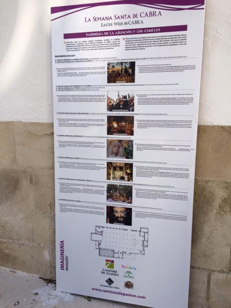 Con la intención de poner en valor la riqueza patrimonial de sus municipios y dar a conocer su Semana Santa, Caminos de Pasión ha puesto en marcha una señalización específica en español e inglés sobre la imaginería que atesora cada una de las iglesias de la ruta turística. Así, la pasada semana se comenzaron a instalar en los templos de Priego de Córdoba y Cabra paneles explicativos que informan a vecinos y turistas no sólo de los detalles de cada una de las tallas (autoría, fecha, historia, etcétera) sino también de la hermandad a la que pertenecen, el día en que procesiona y las características de cada paso (número de cofrades, vestimenta, peculiaridades del recorrido...).