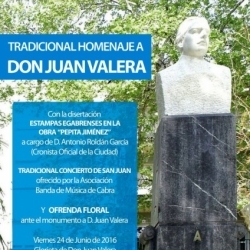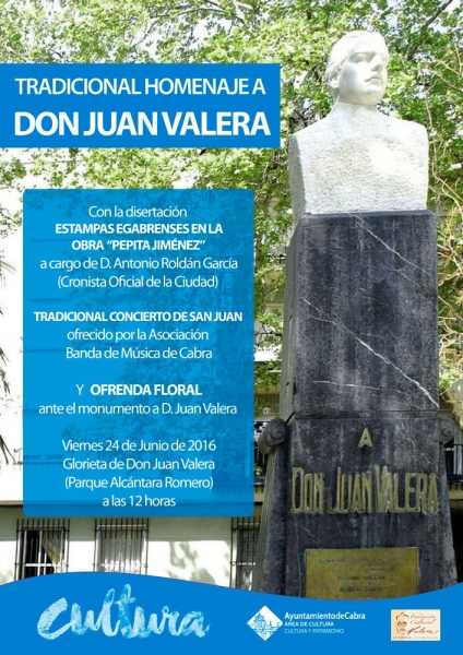 El homenaje a Valera de este año estará a cargo de Antonio Roldán García, uno de los cronistas de la ciudad que disertará sobre Estampas egabrenses en la obra Pepita Jiménez. Será en la Glorieta de Juan Valera del Paseo. Previamente en la noche del 23 tenía lugar la inauguración del alumbrado y recinto ferial en La Tejera y la hoguera de San Juan a medianoche, la presentación de libros - El Valor del dinero de Ugo Biggeri y la adaptación de Pepita Jiménez de Guillermo Mª González -, el concierto de San Juan del Centro Filarmónico en el Teatro El Jardinito o el Mercado Eco-artesano que pone en marcha Subbética Ecológica en el Salón del Paseo, entre otras actividades lúdicas y culturales.