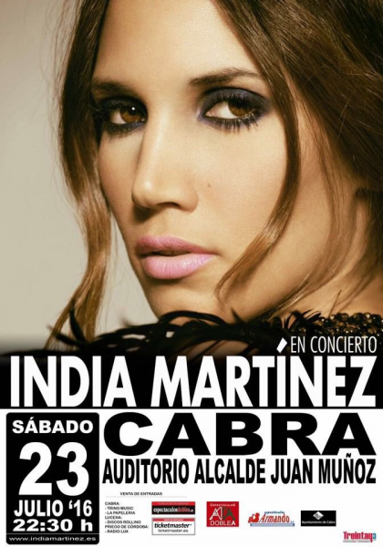 Y el sábado 23 a las 22:30h tendrá lugar uno de los conciertos más señalados del intenso programa de este Verano. India Martínez deleitará a sus seguidores en su gira de verano, tras haber actuado en Zaragoza, Almería, Sevilla o Málaga. En este concierto la mayoría de sus fans acudirán al Auditorio de Cabra, a modo de despedida porque la artista cordobesa está en la recta final de su bloque de conciertos veraniegos.