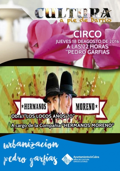 En la noche del jueves la campaña cultural A pie de barrio, la compañía Hermanos Moreno presenta la representación teatral Los locos años 70, en un espectáculo circense que tendrá lugar en la Urbanización Pedro Garfías, completando así el recorrido por todos los barrios y núcleos rurales de Cabra.