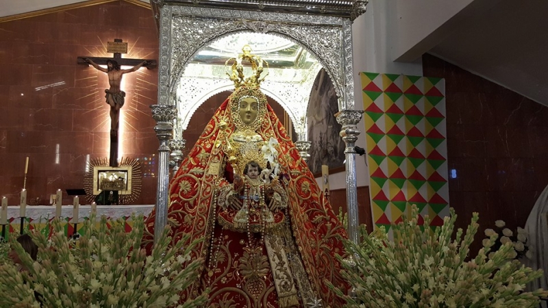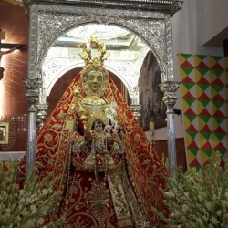 La Virgen está ya en Cabra, en su primera parada en la parroquia de San Francisco y San Rodrigo, en la barriada que lleva su nombre. Ya está preparada para su entrada triunfal, revestida con el precioso terno rojo que bordaran las Agustinas Recoletas a mediados del siglo XIX