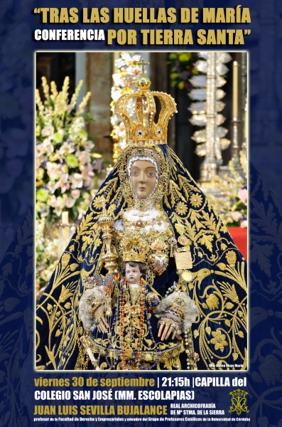 También continúan las actividades en torno a la Virgen de la Sierra que ya se acercan a la última semana de estancia en nuestra ciudad pues volverá al Santuario el próximo 9 de octubre. Así en la noche del viernes y en la iglesia de las Escolapias, impartirá una conferencia el profesor de la Universidad de Córdoba, Juan Luis Sevilla Bujalance bajo el título Tras las huellas de María en Tierra Santa. Será a las 21:15h del viernes 30 de septiembre.