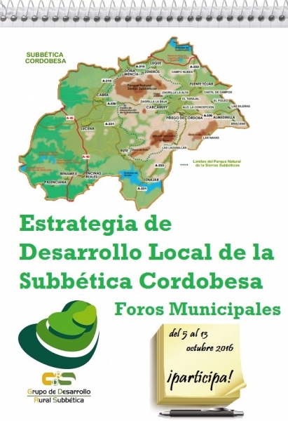 El Grupo de Desarrollo Rural de la Subbética (GDR) está elaborando la estrategia de desarrollo local participativo 2015 - 2020 para nuestra comarca. Enmarcado en el plan de desarrollo rural de Andalucía, se invita a participar a la ciudadanía para que aporten sus propuestas y participen en estos foros.