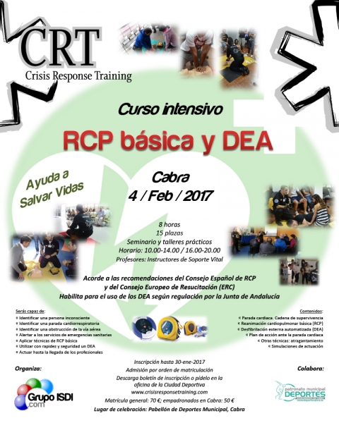 El 4 de febrero se llevará a cabo un curso intensivo de RCP básica y DEA para la identificación y primeros auxilios en los casos de paradas cardiorrespiratorias, reanimación cardiopulmonar básica y desfibrilación externa automática.
