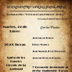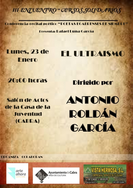 Para este lunes, 23 de enero, la cita será a las 20 horas en SALÓN DE ACTOS DE LA CASA DE LA JUVENTUD, donde tendrá lugar un recital poético bajo el lema "Poetas egabrenses de siempre" (ULTRAISMO). Dirigido por Antonio Roldán García será presentado por Rafael Luna García.