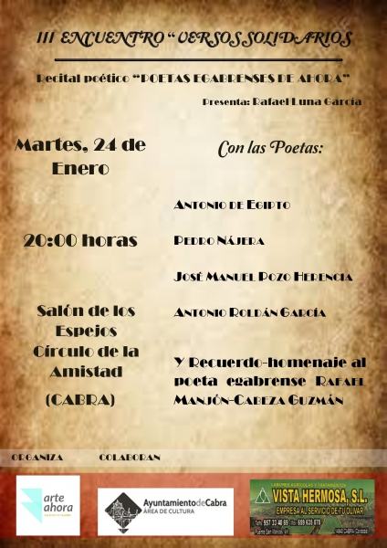 Mañana martes, 24 de enero, el lugar escogido es el SALÓN DE LOS ESPEJOS, CÍRCULO DE LA AMISTAD y la misma hora, las ocho de la tarde. Podremos asistir a un nuevo recital poético "Poetas egabrenses de ahora", en el que van a participar Antonio de Egipto, Pedro Nájera, José Manuel Pozo Herencia, Antonio Roldán García y recordando al poeta egabrense RAFAEL MANJÓN-CABEZA GUZMÁN. Rafael Luna García es el moderador/presentador.