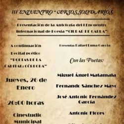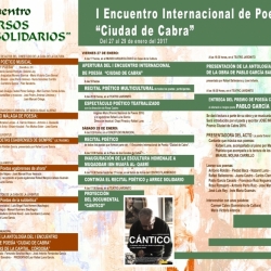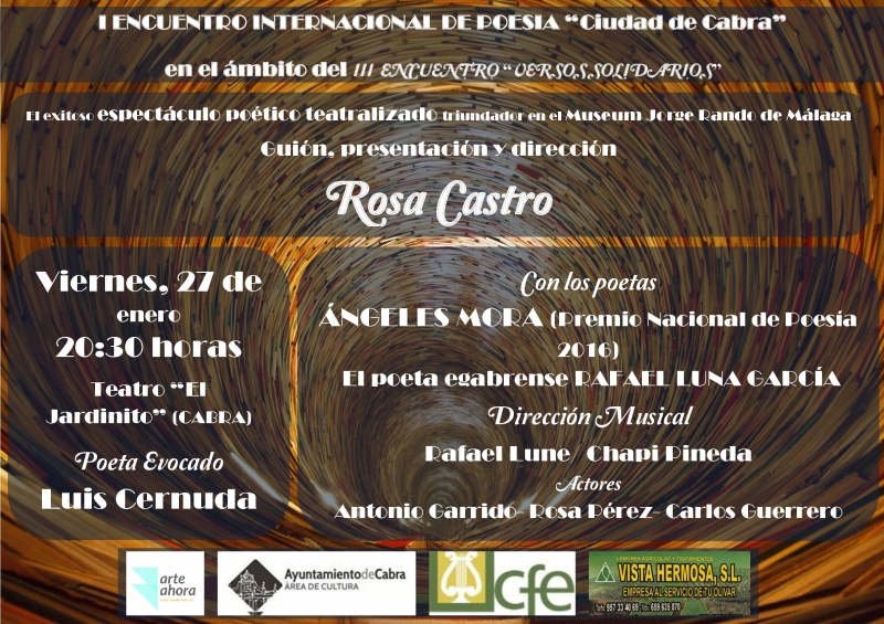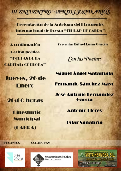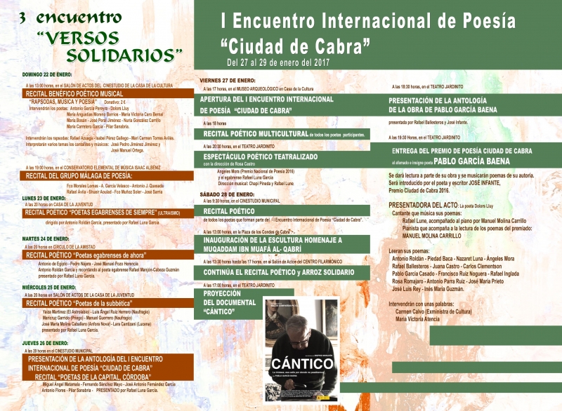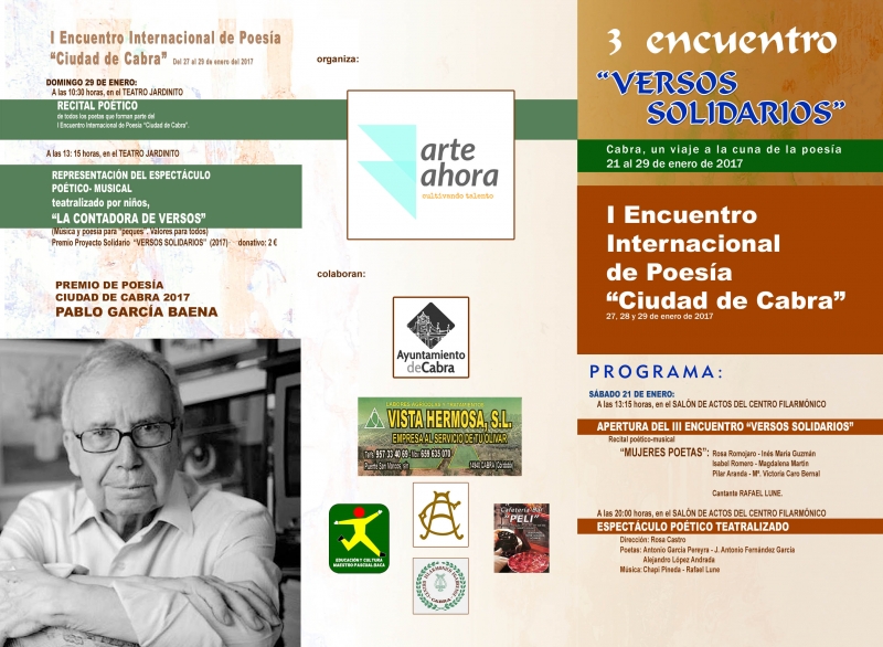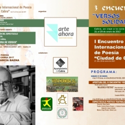 De la misma manera, en el ámbito del ENCUENTRO "VERSOS SOLIDARIOS" se instaura y ve la luz el I ENCUENTRO INTERNACIONAL DE POESÍA "CIUDAD DE CABRA", que se celebrará (D.m.) del 27 al 29 de enero de 2017, con más de 70 poetas de todas las partes del mundo. Como acto central de las actividades que llegan a su punto final el próximo fin de semana va a tener lugar también la entrega del PREMIO DE POESÍA "CIUDAD DE CABRA" (2017), el sábado 28 de enero de 2017. que recogerá el considerado el mejor poeta vivo español de la actualidad, Pablo García Baena, a las 19:30h en el Teatro El Jardinito de nuestra ciudad.