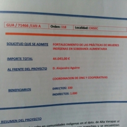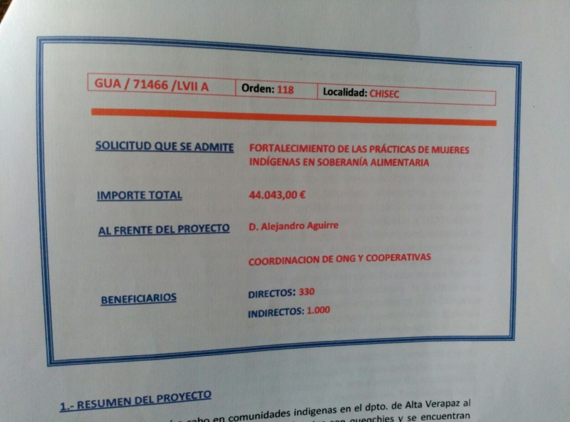 El importe de este proyecto se sitúa en torno a los 41.000 euros y afecta a más de trescientas personas como beneficiarias directas y unas mil de manera indirecta, en la localidad de Chisec, departamento de Alta Verapaz (Guatemala).