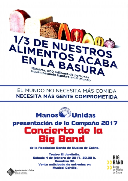 El próximo sábado 4 de febrero, en el Teatro El Jardinito se presenta esta campaña a las 20:30h con una entrada de 3 euros que se destinarán íntegramente a la financiación del proyecto. En el acto de presentación de la campaña de Manos Unidas 2017, actuará la Big Band de la AIM Banda de Música de Cabra.
