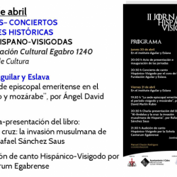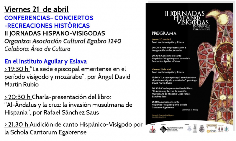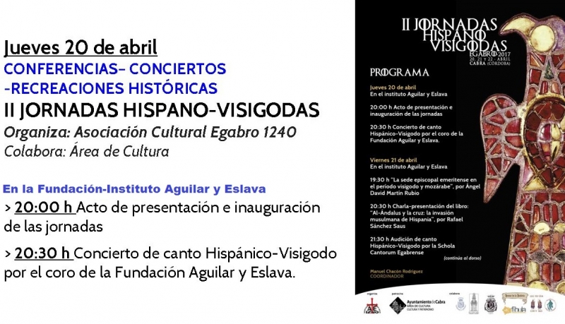 Esta tarde a las 20:00h se inauguran las jornadas en la Fundación-Instituto Aguilar y Eslava con una presentación de las mismas y a continuación un concierto pedagógico a cargo del coro de la Fundación Aguilar y Eslava, dirigido por Mª José Villatoro Campaña, que ofrecerá una muestra de cantos hispano-visigodos.