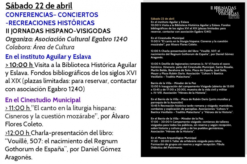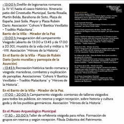 A lo largo de estos tres días tendrán lugar conciertos, presentación de libros, visita a la biblioteca histórica Aguilar y Eslava, recreaciones históricas, talleres para todas las edades, conferencias, desfile hispano-romano y otras recreaciones de la época en la que podremos conocer de primera mano tanto la indumentaria y costumbres de la cultura hispano-romana y también del mundo hispano-visigodo y godo en general. En estas actividades colaboran las asociaciones "Cohors V Baetica Vexillatio - Traditio Malacitana" y la Asociación "Héroes de la Historia". Un taller de orfebrería para los más pequeños tendrá lugar en el Museo Arqueológico Municipal, realizado por Fíbula Didáctica del Patrimonio, donde aprenderán diversos aspectos sobre la cultura visigoda dentro de la realización del taller.
