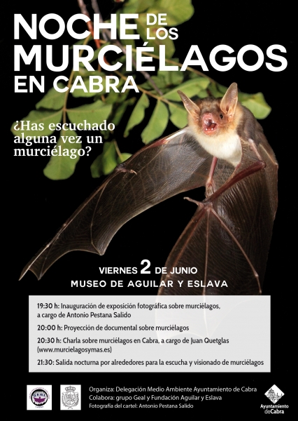 Organizada por la delegación municipal de Medio Ambiente, con la colaboración del Grupo GEAL y el Museo Aguilar y Eslava, la Noche de los murciélagos en Cabra tendrá lugar a partir de las 19:30h del próximo viernes 2 de junio en el Aula Juan Carandell del Museo Aguilar y Eslava y terminará con una salida nocturna.