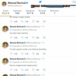 Según su biografía de Twitter, Manuel Bartual dibuja en la revista @orgulloysatisfa, diseña para @Astiberri y es director de la película @todostusecretos. Es un editor, historietista y diseñador gráfico que había comenzado sus vacaciones y se disponía a contarlas el pasado lunes.