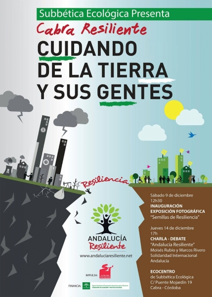 Junto a la exposición fotográfica, Subbética Ecológica se suma a la campaña de Solidaridad Internacional Andalucía, para lo que han organizado también una charla-debate Andalucía Resiliente que tendrá lugar el jueves 14 de diciembre a las 17:00h en el Ecocentro, con el objetivo de "realizar una reflexión colectiva sobre el crecimiento industrial y el agotamiento de los recursos naturales entre otros desafíos y, al otro lado de la ecuación, la oportunidad para desarrollar nuevas formas de distribución y organización social en busca del buen vivir y el bien común". En esta charla van a participar Moisés Rubio Rosendo y Marcos Rivero Cuadrado, integrantes de Solidaridad Internacional Andalucía, dos de los principales promotores de la campaña, que ofrecerán detalles de la misma y experiencias de resiliencia.