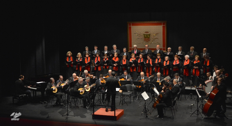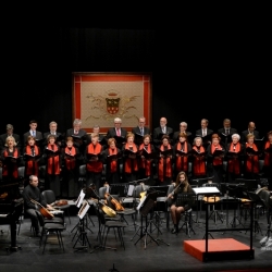 Se abrieron las cortinas y apareció el Coro en el escenario, luciendo las féminas un vestuario muy elegante y vistoso, traje largo negro y foulard rojo y ellos traje y corbata de distintos colores.