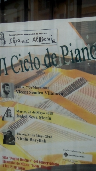 El primero fue el 7 de mayo a cargo de Vicent Sendra Vilanova, de Pego (Alicante), alumno de Diego Cayuelas, que ya repetía en Cabra. Por motivos personales no pude asistir, pero ya escuché al intérprete el pasado año y fue un ejecutante superior. Este año, con más experiencia, según algunos asistentes, hizo con gran solvencia obras de Scarlatti, Liszt, Brahms y Albéniz.