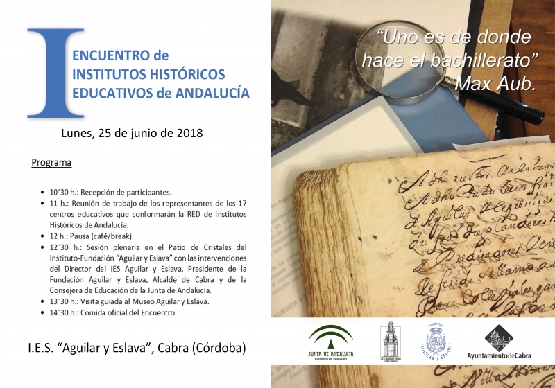 Como anunciamos en su día en La Opinión de Cabra, (BOJA de 1 de marzo de 2018) la Consejería de Educación de la Junta de Andalucía ha reconocido a diecisiete centros de secundaria y bachillerato como Institutos Históricos Educativos en Andalucía, entre los que figura el I.E.S. Aguilar y Eslava.