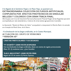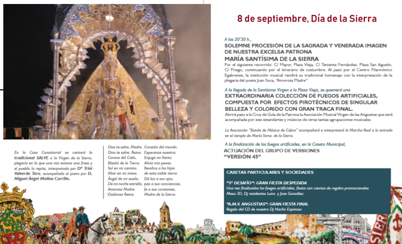 En el programa de hoy se recogen los actos religiosos con la función principal, la tradicional Misa de la Bandera y la procesión solemne que recorrerá las calles para festejar a la venerada y antiquísima imagen de Nuestra Señora, María Santísima de la Sierra, con la que se dará por cerrada la semana de fiestas.
